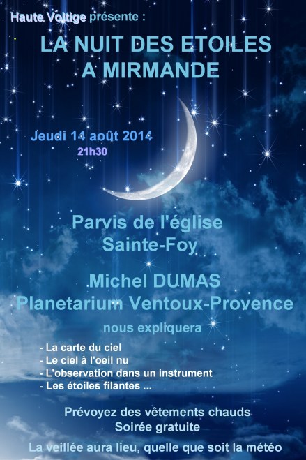 Organisée par la jeune association mirmandaise Haute Voltige, la nuit des étoiles se tiendra sur le parvis de l’église Ste Foy (au sommet du village) le jeudi 14 août prochain à 21h30. Si le mauvais temps venait contrarier la veillée, les participants seraient invités à se déplacer à l’intérieur de l’église où une simulation informatique ludique leur serait projetée.