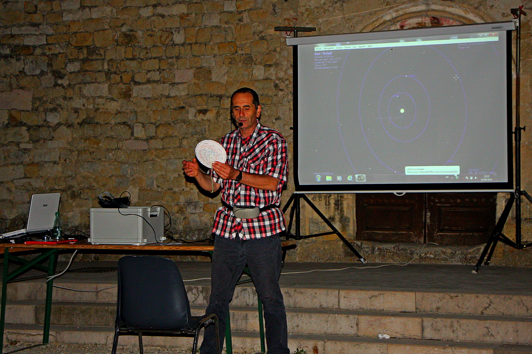 Dès 20h30, les premiers observateurs en herbe ont pris place sur les chaises aimablement mises à leur disposition par la mairie de Mirmande ; le ciel chargé, mais suffisamment dégagé à cette heure permettait d’espérer un déroulement complet de l’observation. Les premiers arrivants ont d’ailleurs pu entrevoir le passage de la Station Spatiale Internationale (ISS) jouant à cache-cache avec les nuages sur une trajectoire ouest-est. La situation ne s’améliorant pas, l’observation directe des étoiles se compliquait et le recours au virtuel s’imposait. Vers 22h, le parvis de l’église Ste Foy était … noir de monde !