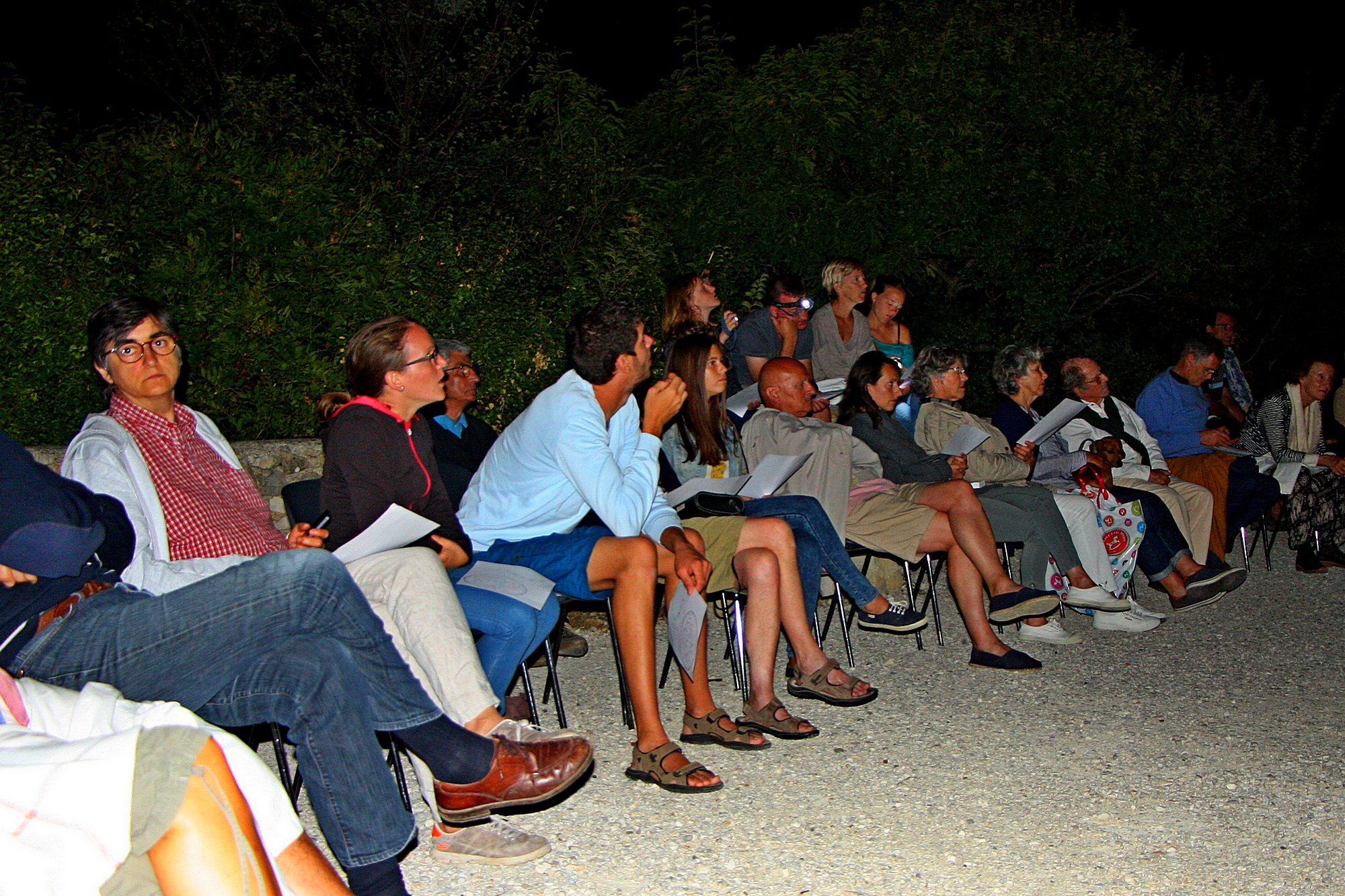 Intéressant, passionnant même … sauf que les étoiles filantes avaient décidé de jouer au-dessus de la couche, nous privant ainsi de la seconde partie de la nuit. La couverture nuageuse rendant impossible toute observation, les nombreux visiteurs ont quitté progressivement l’église Ste Foy, quelques irréductibles décidant tout de même de clôturer la soirée tardive en sortant le pique-nique du panier pour un dîner à la belle étoile … restée bien discrète !