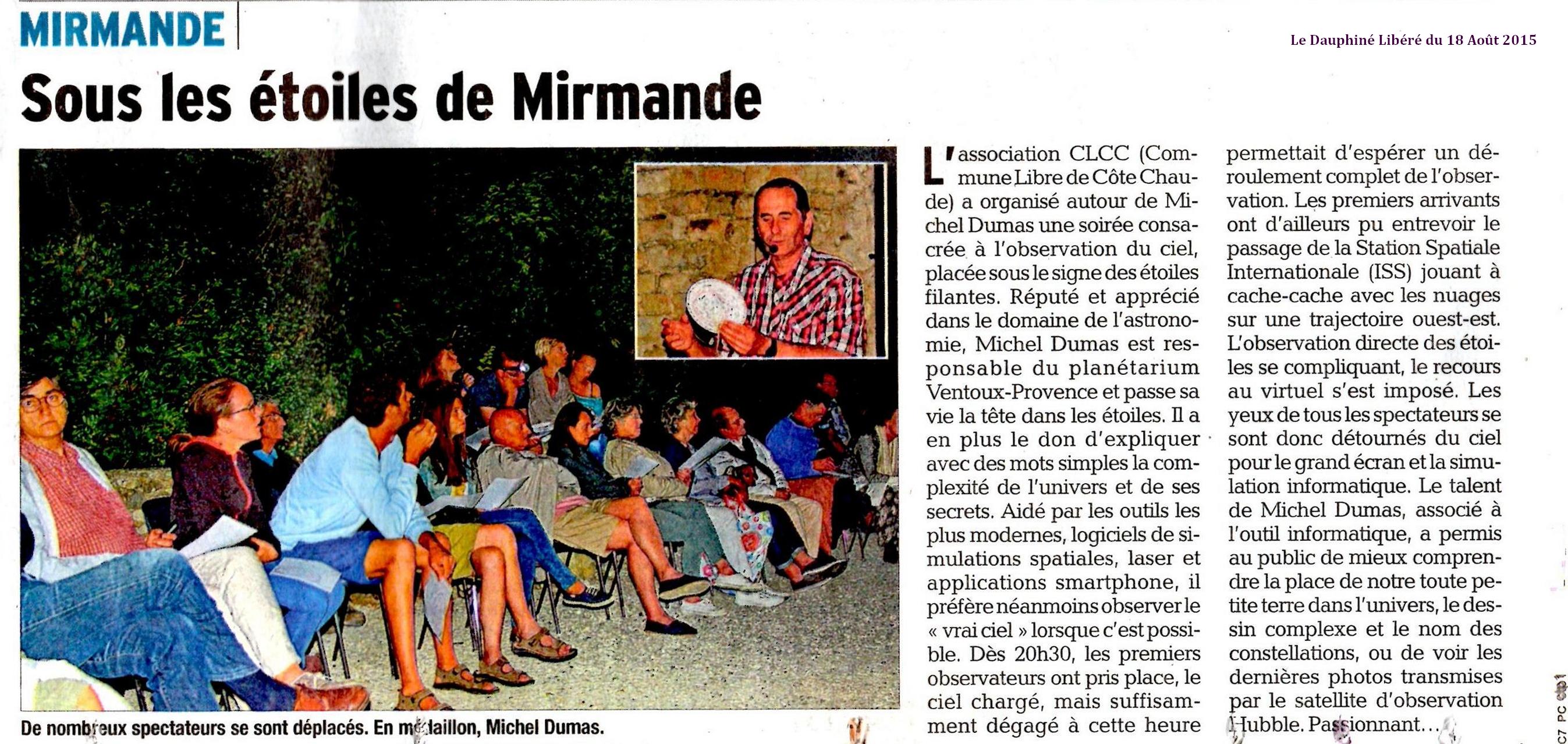 Réputé et apprécié dans le domaine de l’astronomie, Michel Dumas est responsable du planétarium Ventoux-Provence et passe sa vie la tête dans les étoiles ; il a en plus le don d’expliquer avec des mots simples la complexité de l’univers et de ses secrets. Aidé par les outils les plus modernes, logiciels de simulations spatiales, laser et applications smartphone, il préfère néanmoins observer le « vrai ciel » lorsque c’est possible, plutôt que de faire appel à l’informatique quand le « vrai ciel » n’est pas visible et lui joue des tours.